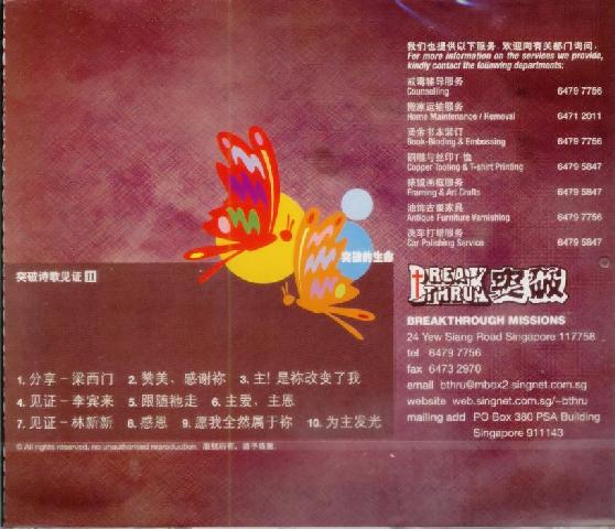 突破诗歌见证里面含有:-1. 分享2. 赞美感谢你3. 主!是你改变了我4. 见证5. 跟随他走6. 主爱,主恩7. 见证8. 感恩9. 愿我全然属于你10. 为主发光
