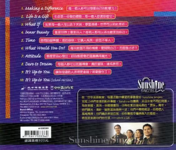 Sunshine 组合 青春最爱,首张专辑 Life Is a Gift 阳光浸润出歌声,叶绿素音乐质感 此专辑为CD加伴唱 包含了10首轻快活泼歌曲。现在应试来听他们的主张。