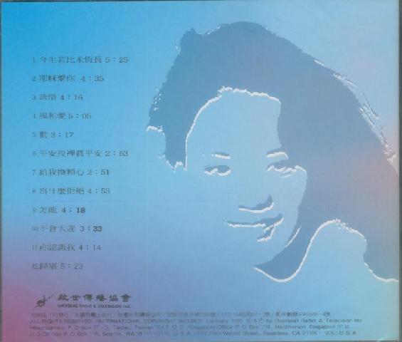 王芷蕾,著名的台湾歌手,这张专辑是1995年天韵的作品,这张专辑再一次更新了你的生命。推荐歌曲:耶稣爱你,给我换颗心,你认识我。