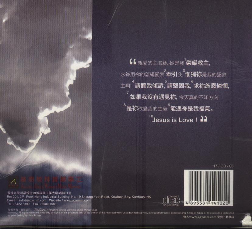 粤语敬拜专辑 (新曲+精选) 出版日期﹕2006年10月[序]亲爱的主耶穌,祢是我荣耀救主,求祢用祢的慈绳爱索牵引我,惟独祢是我的拯救,主啊﹗请听我倾诉,请坚固我,求祢施恩怜悯,如果我没有遇见祢,今天真的不知方向,是祢改变我的生命,能遇祢是我的福气。Jesus is Love﹗
