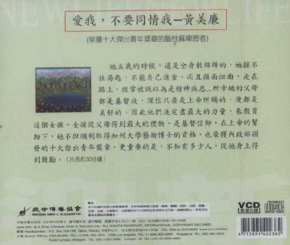 爱我,不要同情我-黄美廉(荣获十大杰出青年奖章的脑性麻痹患者)她五岁时候,还是全身软绵绵的,她握不住汤匙,不能自己进食,而且颜面扭曲,走在路上, 经常被误以为是精神病患...所幸她的父母都是基督徒,深信只要是上帝所赐的,便都是美好的,因此他们决定尽最大的力量,来教育这个女孩。女孩从父母得到最大的礼物,是基督信仰,在上帝的帮助下,她不但顺利取得加州大学艺术博士的资格,也荣获内政部颁发的十大杰出青年奖章,更重要的是,不知有多少人,从她身上得到鼓励。